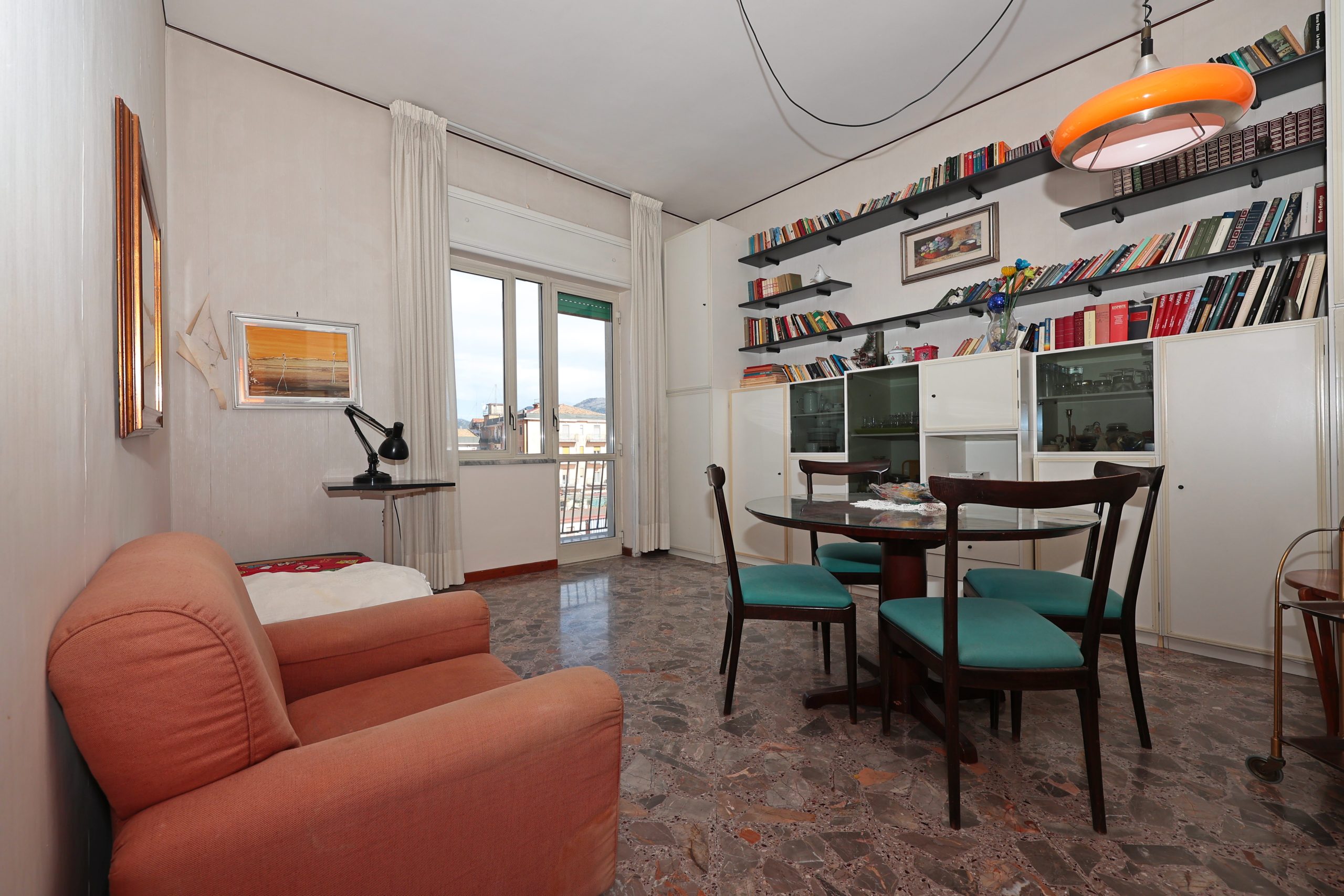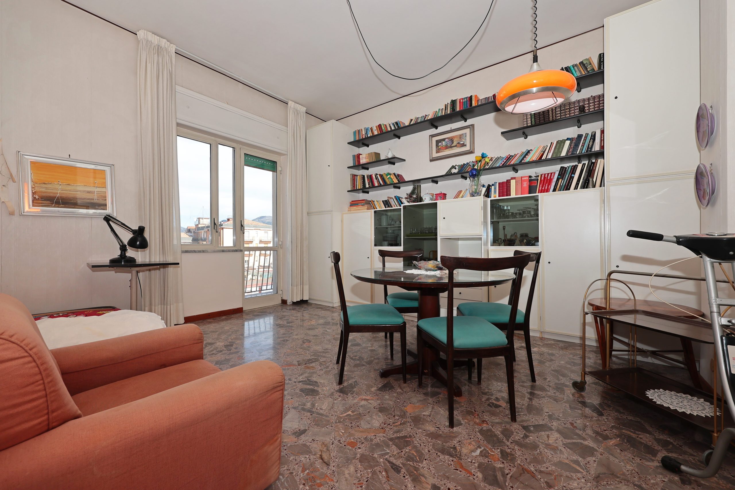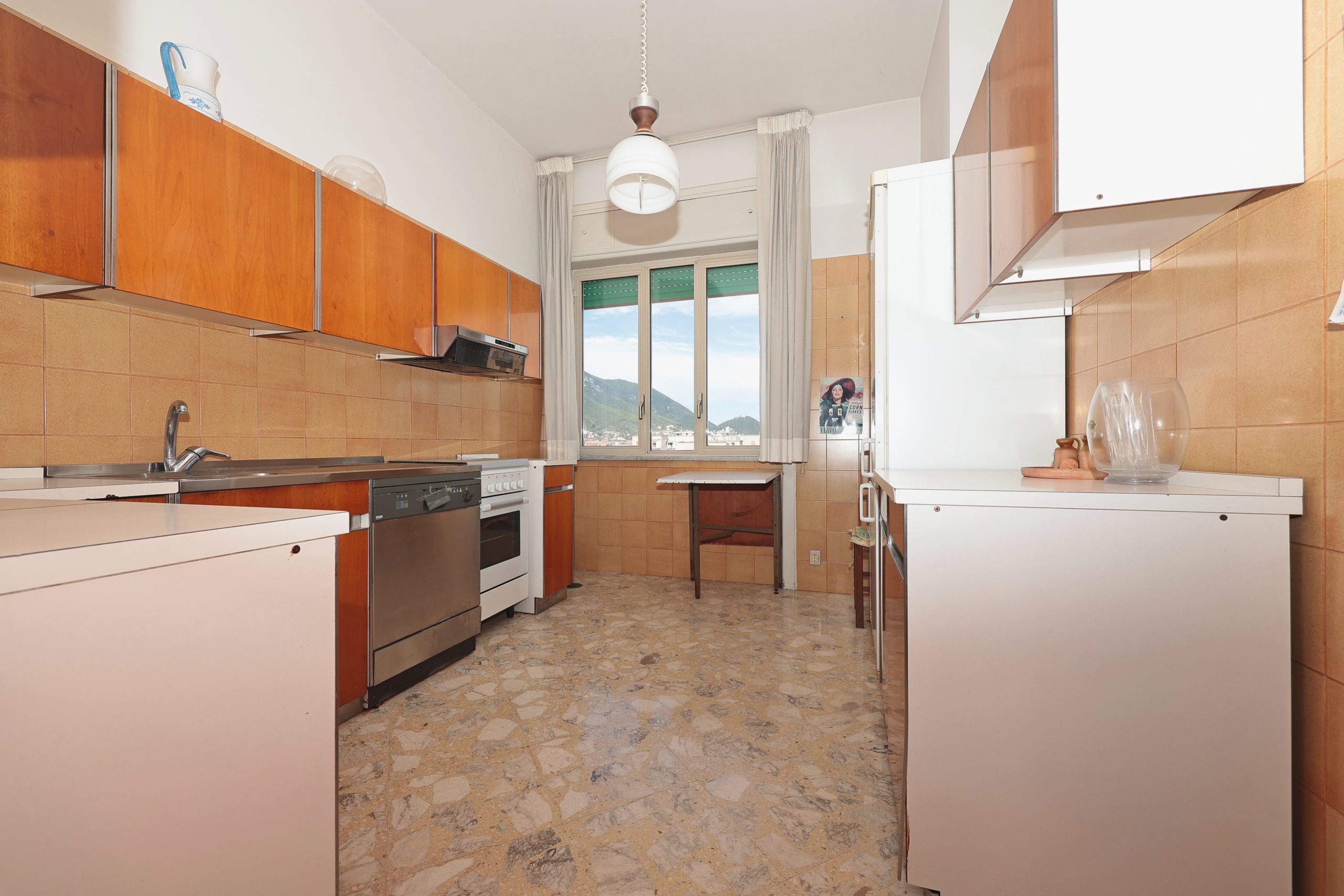 Composto da ampio disimpegno all’ingresso, salone, 2 camere da letto, cucina abitabile ed un bagno, l’appartamento, dato il piano alto, gode di una splendida vista sulla città dal Duomo, a Monte Finestra a monte Castello ed è naturalmente luminoso.